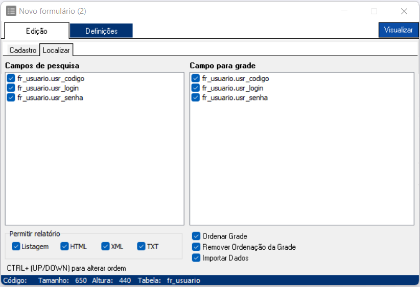 . Executada uma dessas ações, de imediato, aparece(m) o(s) campo(s) na grade Campos do Formulário.