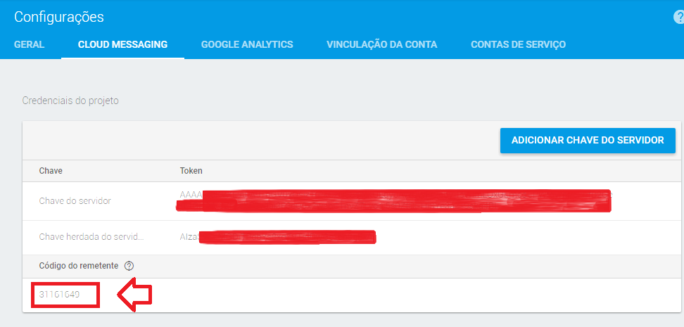 O código do remetente, obtido no procedimento realizado anteriormente, será utilizado com a função Push - Registrar Dispositivo.
