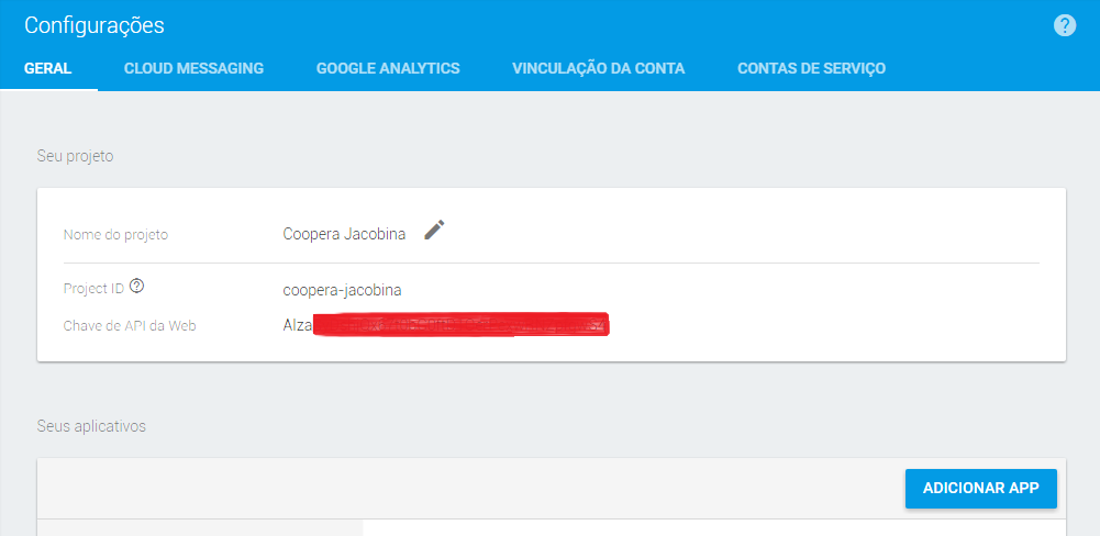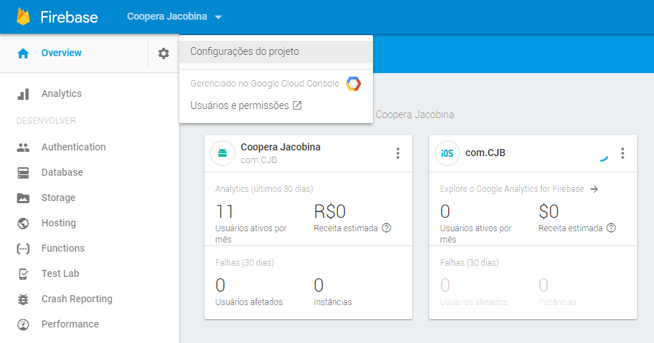 Em seu console do Firebase, abra as configurações do seu projeto:
