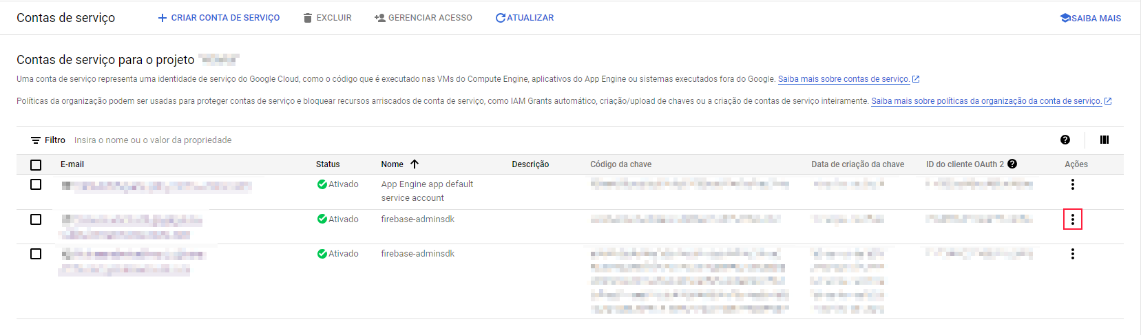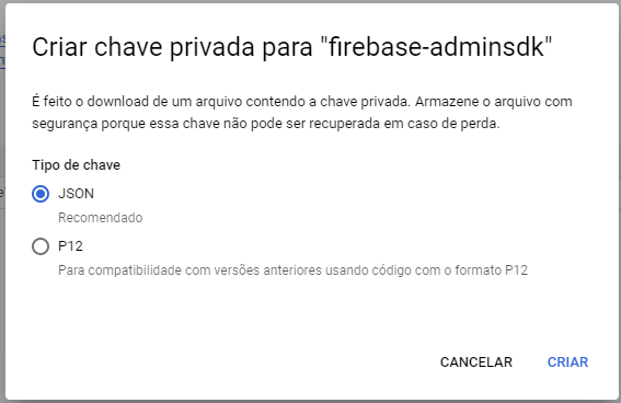 - Para criar a chave de API, acesse o console do Firebase, clique em Configurações do Projeto e em Contas de Serviço. Clique em Gerar Nova Chave Privada e salve o arquivo .json em um local seguro. Segue um exemplo de como criar a chave de API: