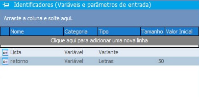 Adicione duas variáveis. A primeira, do tipo Variante, será chamada de Lista e a segunda, do tipo de Letras, será chamada de retorno.