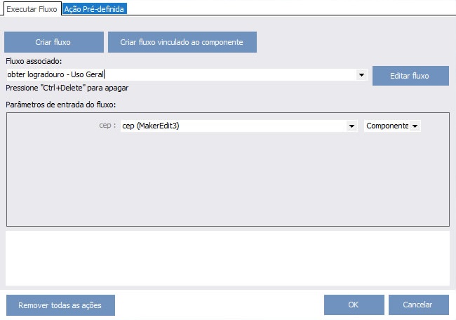 Salve o fluxo com o nome Obter logradouro e associe o fluxo ao componente botão, associando o componente Cep , para que seja referência do parâmetro de entrada Cep.