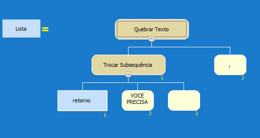 - Acima da função Troca Subsequência informe a função Quebrar Texto e em seu segundo parâmetro informe “,” (vírgula). Para que a string retornada pelo WebService seja transformada em lista separando cada elemento por, (vírgula). Por fim, retorne seu valor a variável Lista.