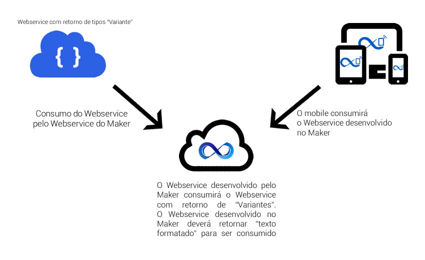 Atualmente, o Maker Mobile em sua versão 1.0 suporta apenas o consumo de Webservices que retornem tipos primitivos como "Letras", "Data/Hora", "Fracionado", "Inteiro" ou "Lógico". Desta forma, caso o Webservice consumido retorne tipos como "Lista", "Mapa" ou "Variantes" o retorno será tratado como "Nulo" não sendo possível obter o valor retornado.