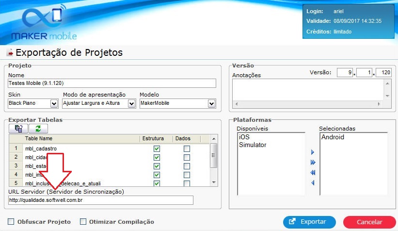 Depois de cadastrado o sistema no Maker Mobile Manager volte para o Maker. Abra o menu Exportar para plataforma. Antes de clicar no botão Exportar, o campo URL Servidor (Servidor de Sincronização) deve ser preenchido com o endereço de onde está a base do manager.