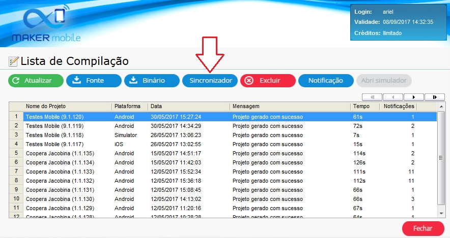 Preenchido o campo URL exporte a aplicação. Ao terminar a exportação selecione o projeto na grade da tela Lista de Compilação e clique no botão Sincronizador.