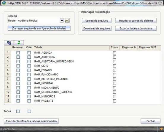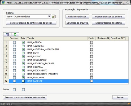 Existem dois campos check nesta grade, Remover e Criar. Os mesmos servem para remover ou criar as tabelas na base do Manager. Selecione as tabelas que deseja sincronizar com a aplicação móvel e clique no botão Executar tarefas das tabelas selecionadas para criar as tabelas desejadas.