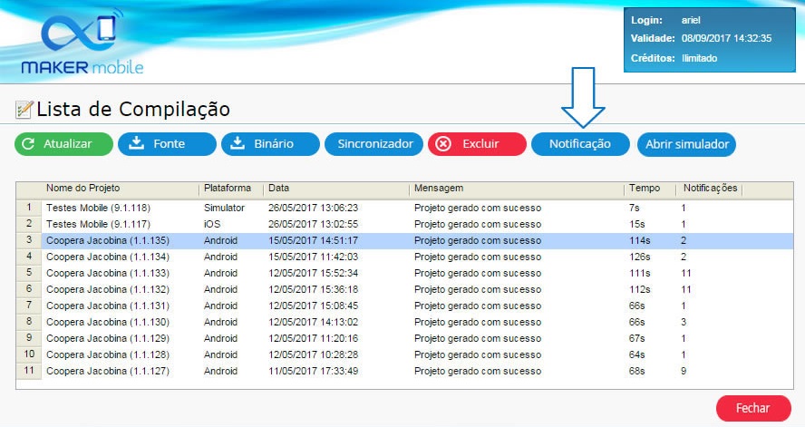 - Observe que ao selecionar um projeto o botão de Notificação será habilitado.