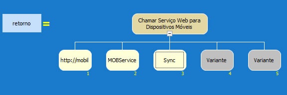 - Insira um objeto processamento e no montador de expressão determine a função Chamar Serviço Web para dispositivos móveis. Atribua o resultado à variável retorno da consulta.