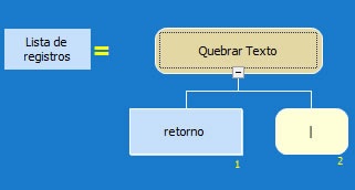 Insira um objeto processamento e no montador de expressão selecione a função Quebrar texto e informe os parâmetros conforme imagem abaixo. Atribua seu retorno a variável Lista de registros.
