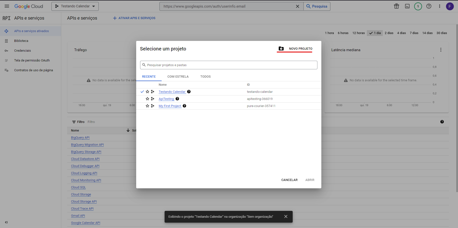 - Crie um projeto para a utilização das funcionalidades Google API. Obs.: Caso a conta cadastrada na Google Cloud seja empresarial é necessário entrar em contato com administrador para efetuar a integração, pois não é possível selecionar e nem criar uma organização com uma conta empresarial na tela de criação de projeto. Ex: [email protected]