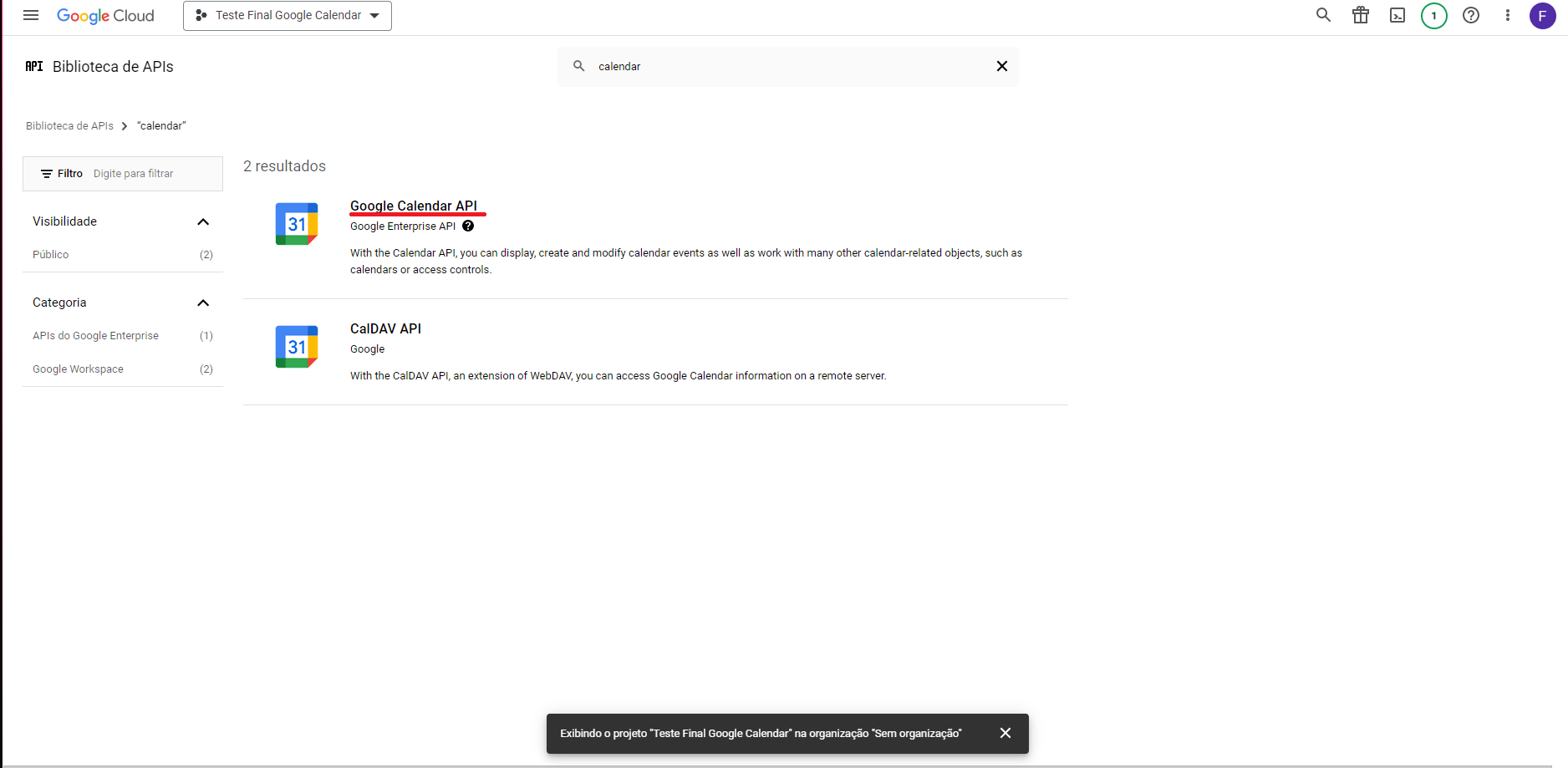 - Na tela de Biblioteca realize uma busca por Google Calendar API e clique em ativar.