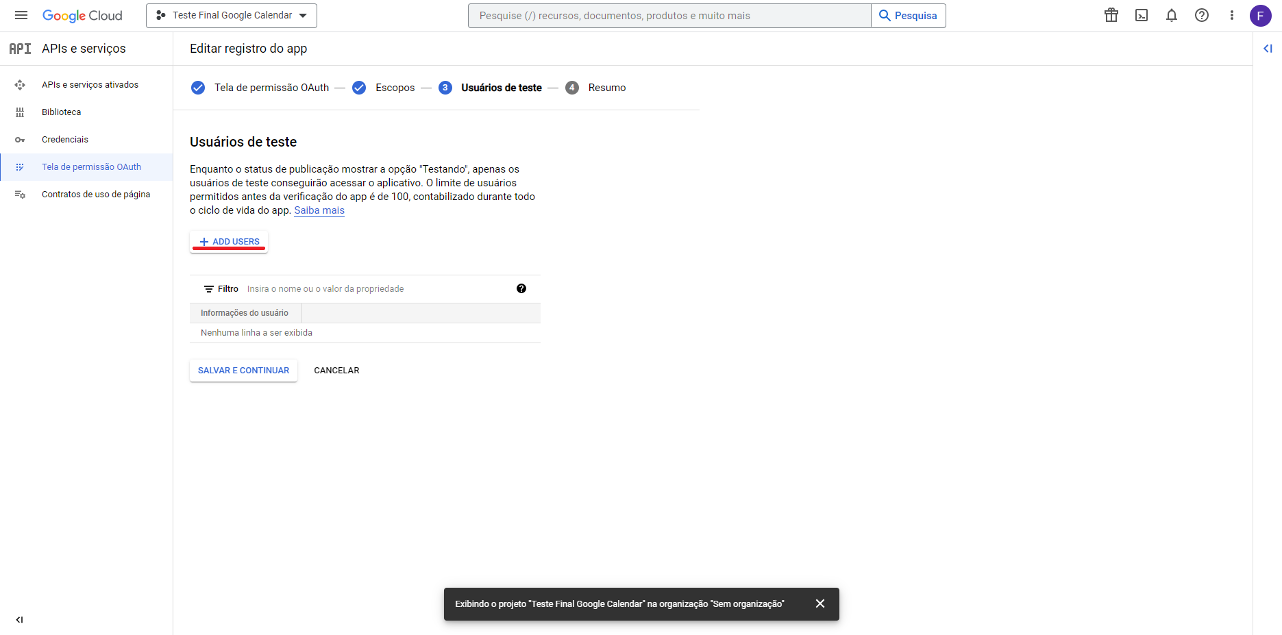 Realizado a configuração da permissão do OAuth 2, iremos adicionar os usuários de testes da API, esses usuários terão a permissão única das contas do Google e poderão testar a integração na fase de testes.