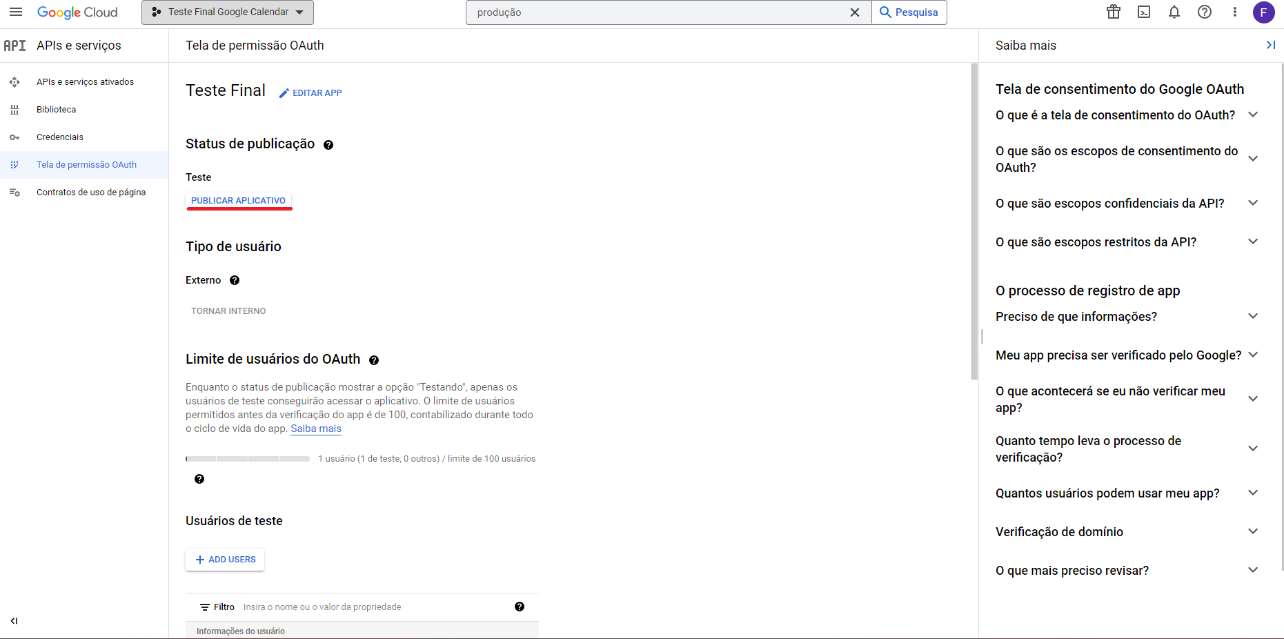 - As configurações é realizada para a utilização do Google Calendar API no ambiente de desenvolvimento/testes, caso queira implementar no ambiente de produção é necessário acessar o console do Google Cloud e localizar no menu Tela de Permissão OAuth e clicar em publicar aplicativo seguindo o passo a passo de configurações. Após um período de avaliação o recurso estará disponível.