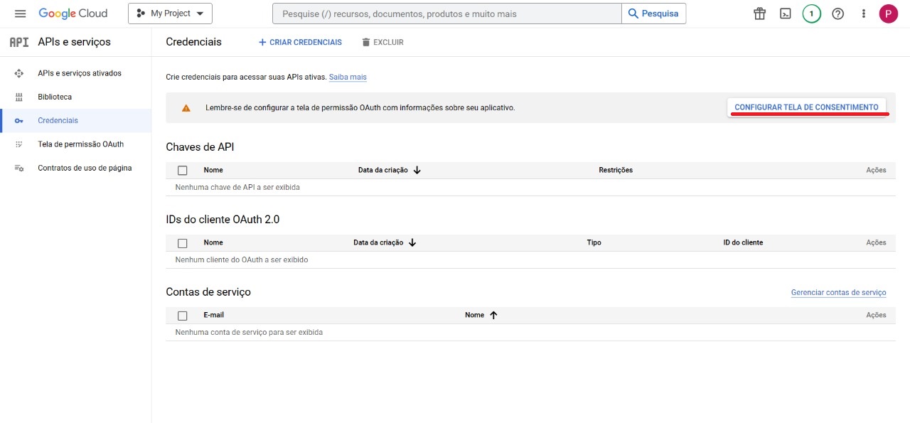 - Finalizada a configuração da tela de permissões volte para a tela de credenciais e clique em Criar Credenciais, primeiro crie uma Chave de API.