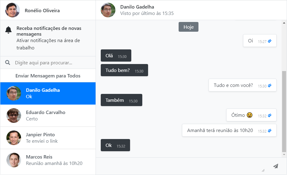 O componente Chat foi criado para ser utilizado na interação entre usuários. O componente utiliza Websocket para comunicação de envio e recebimento de mensagens.