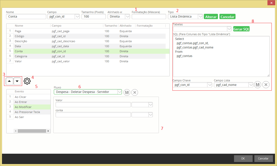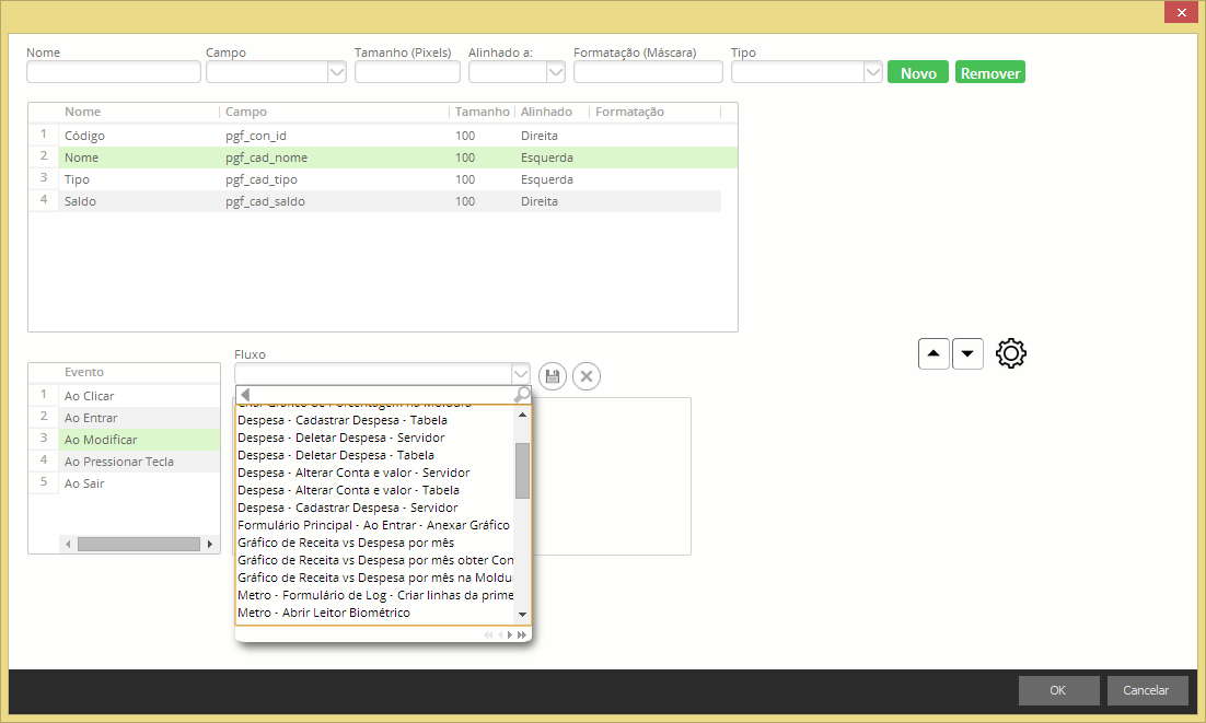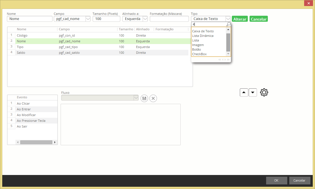 - Eventos: Define o evento que será executado nas colunas (Em modo de Inclusão ou Edição) de acordo com o tipo.